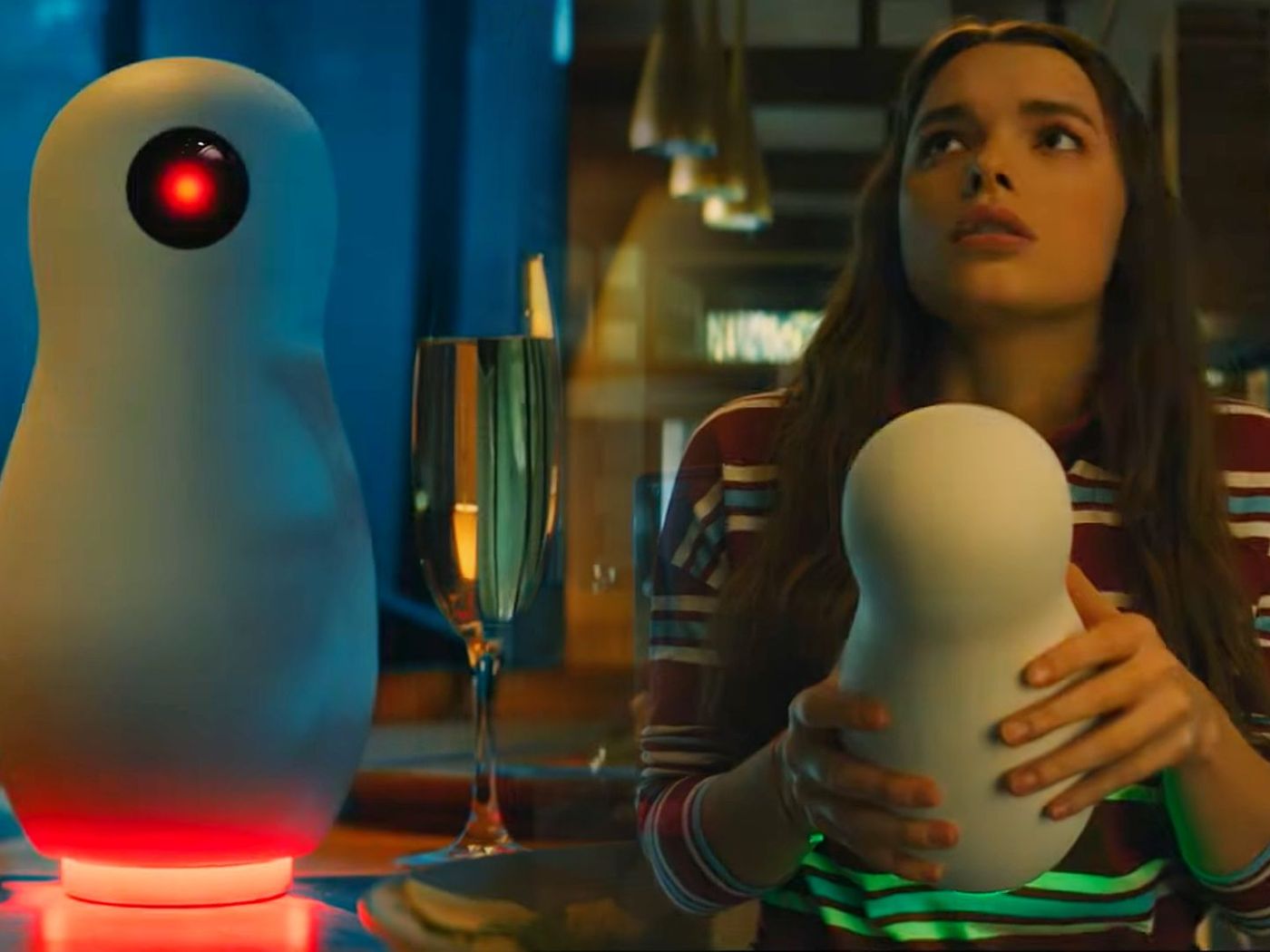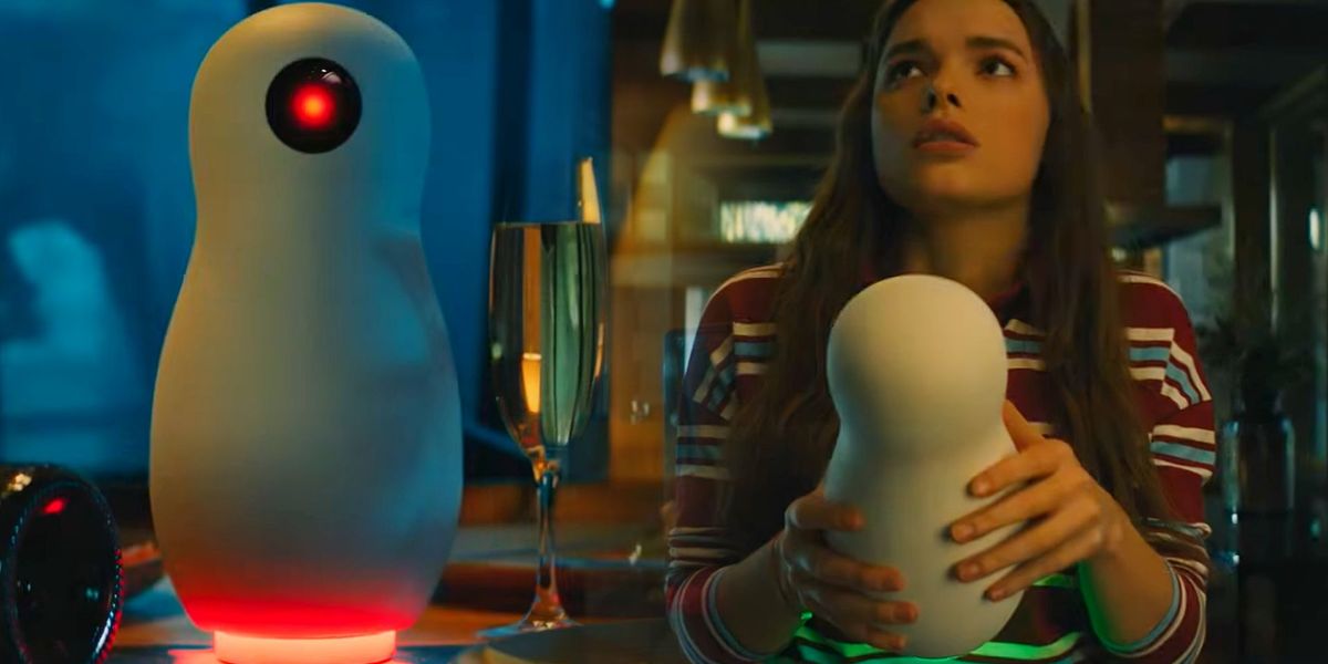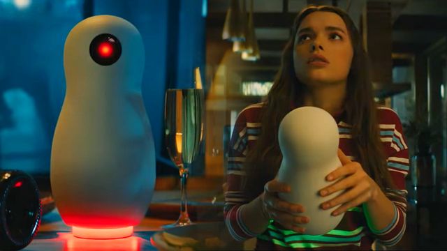 В доме их встречает умная колонка, которая выглядит как какая-нибудь ЕВА из мультика "ВАЛЛ-И": белоснежная, футуристичная, с черным экраном.