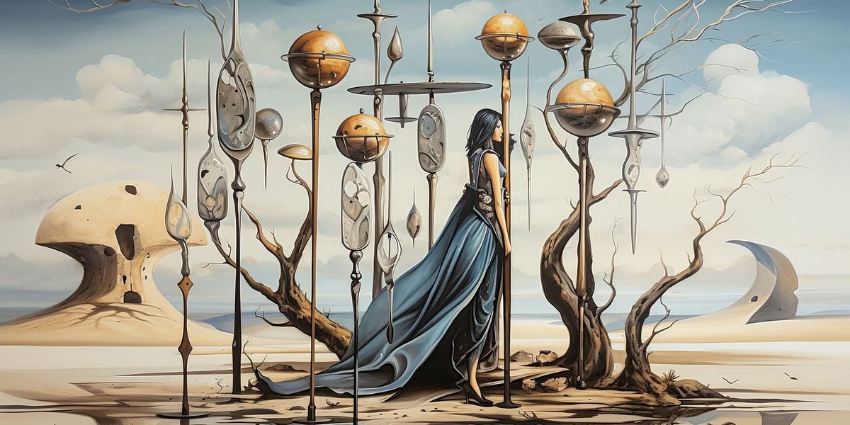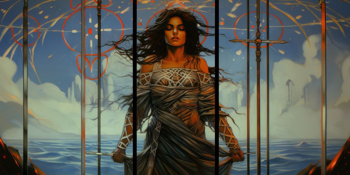 Девушка на Восьмёрке Мечей потеряна и одинока. Она ничего не видит, потому что на её глазах повязка, и не может убежать, потому что связана. А удалось бы развязать руки – всё равно её окружает импровизированная клетка из восьми мечей. Кажется, она ушла слишком далеко от дома, который можно разглядеть на холме, и заблудилась. Она сбита с толку и не знает, куда идти и как быть дальше. Это ловушка, в которой виноваты в большей степени внешние силы.Восьмерка Мечей символизирует ощущение потерянности, бессилия. Выход из трудной ситуации кажется эфемерным. Человек с Восьмёркой Мечей в раскладе чувствует себя узником в ловушке обстоятельств. Возможно, он находится в плену у зависимостей – от пагубных привычек или от других людей. Важно то, что ему кажется – разорвать эти цепи своими силами невозможно.