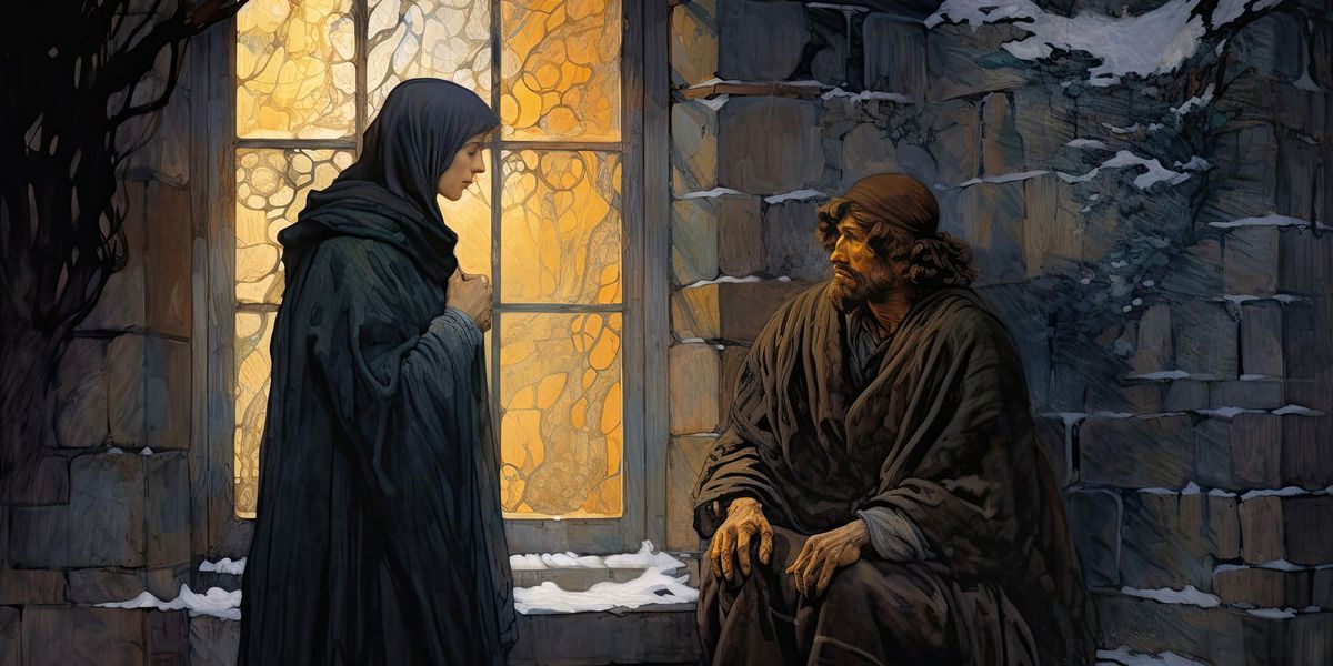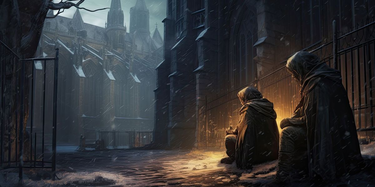 - Церковь. Впрочем, каменная стена с витражом может принадлежать просто дому обеспеченной семьи. Внутри светло, тепло и наверняка сытно. Всё, что отделяет это изобилие от нищеты, царящей на улице – витраж. Это намёк на то, что жизненные обстоятельства могут измениться стремительно, независимо от того, насколько крепки наши стены.