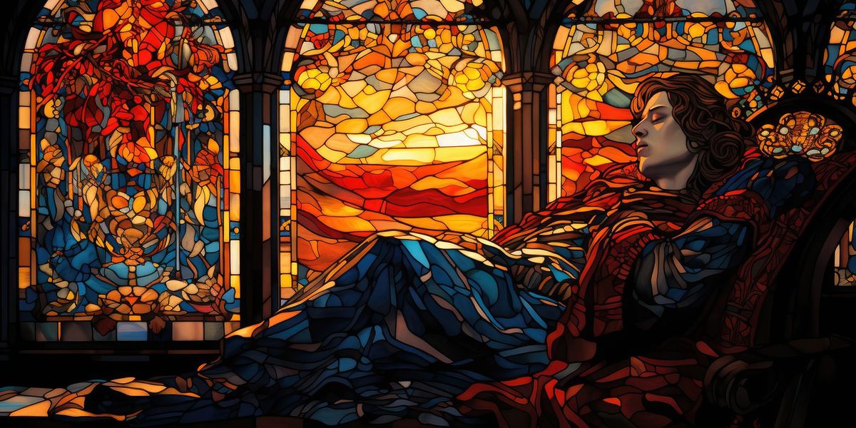 - Витраж. На стене, над рыцарем, можно заметить мозаичное окно. В его левом верхнем углу написано слово «pax» – «мир». Это указывает на то, что смерть рыцаря – не печальное событие. Он боролся за справедливость и теперь почил в мире.