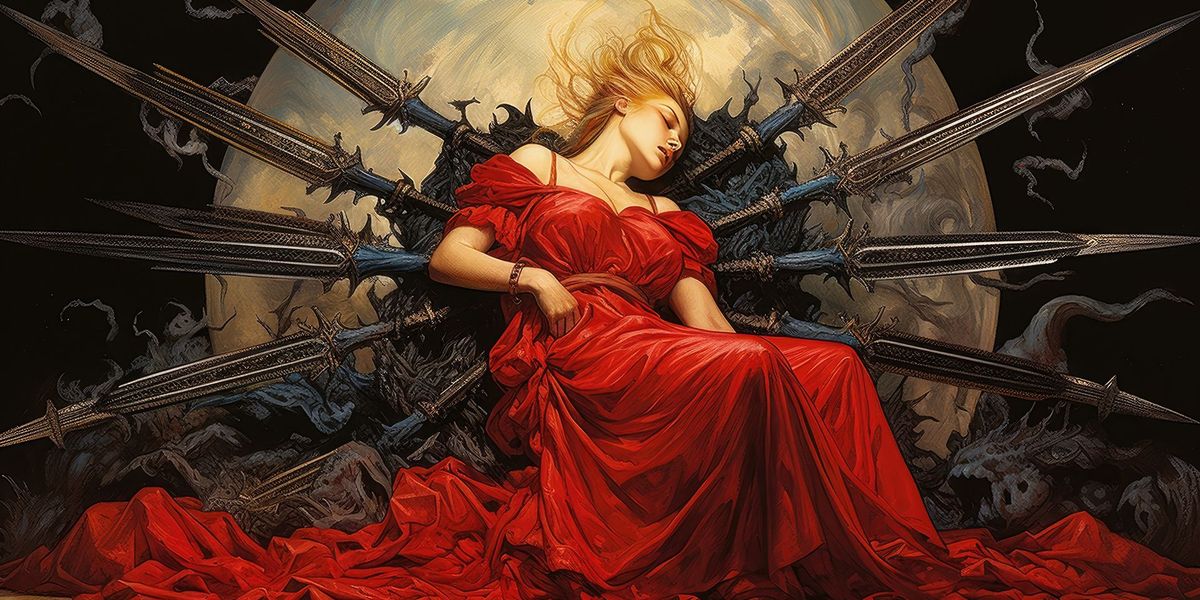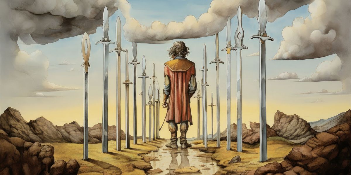 - Самый заметный элемент карты – десять мечей, пронзающих сердце человека, лежащего на земле лицом вниз. Этот образ является метафорой для крайней степени боли от потерь и разрушений, которые могут быть как физическими, так и эмоциональными.