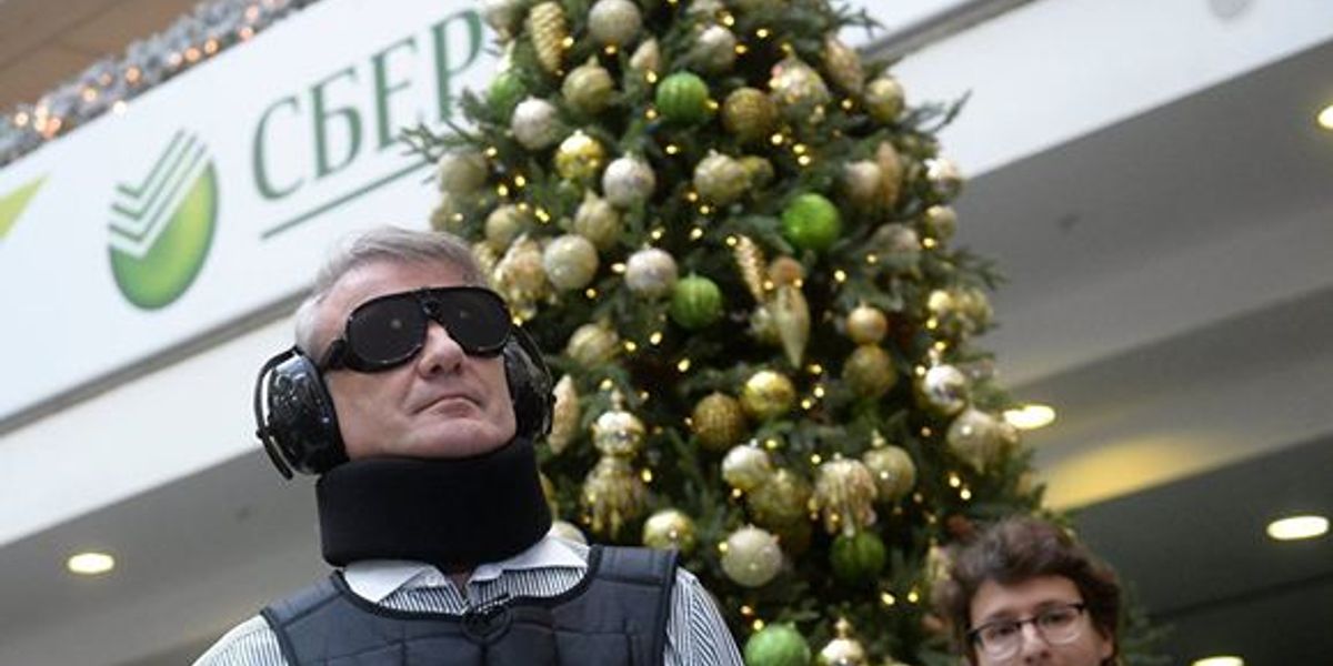 В этом костюме руководитель Сбербанка, решивший протестировать доступность сервисов организации для людей с ограниченными возможностями, попытался получит кредит на инвалидное кресло. Фактически лишенный благодаря костюму зрения и слуха, топ-менеджер получил талончик и подошел к нужному окну. После этого он сообщил сотруднику банка, что хотел бы взять кредит на 100 тысяч рублей и что его зарплата составляет 30 тысяч рублей.