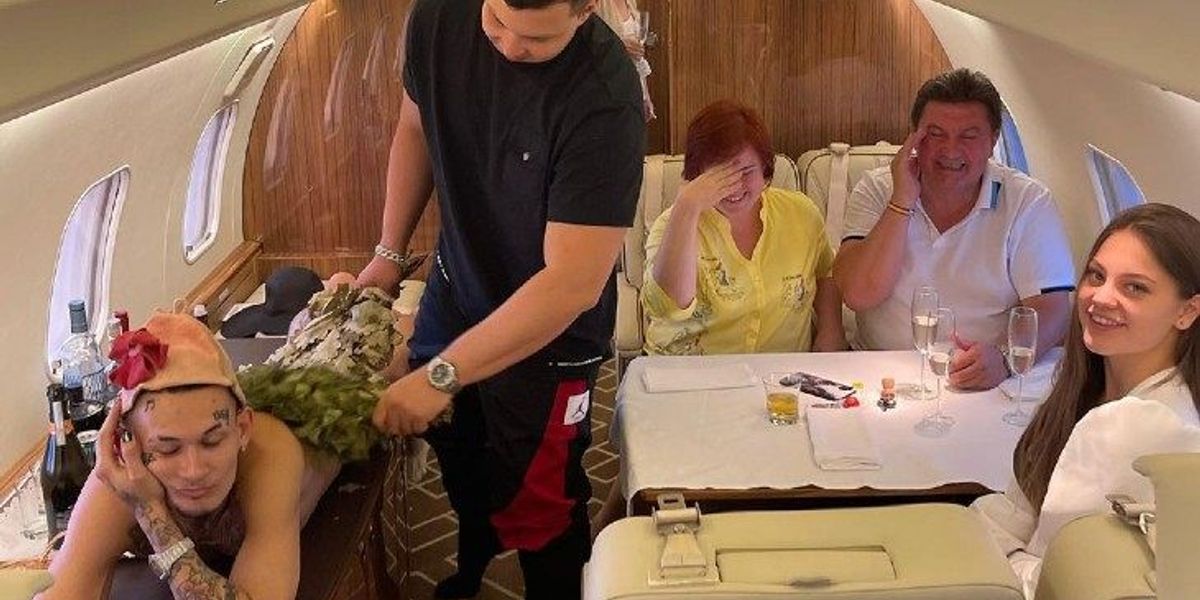 «Зачем лететь в баню на частном самолете, если баню можно сделать в нем» – так Моргенштерн прокомментировал фото, на котором его прямо на борту самолета бьют березовыми вениками. Алишер при этом полностью голый, а рядом сидят смущающиеся родители его девушки Дилары.