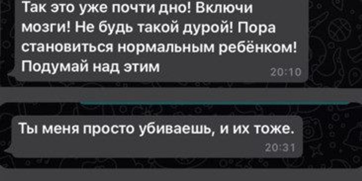 «У тебя что, цель добраться до дна? Так это уже почти дно! Включи мозги! Не будь такой дурой! Пора становиться нормальным ребенком. Подумай над этим. Неприятно от всего, что ты делаешь. Молодец мама, ребенок на дне!» – заявил в переписке отец девочки Максим Аксенов.