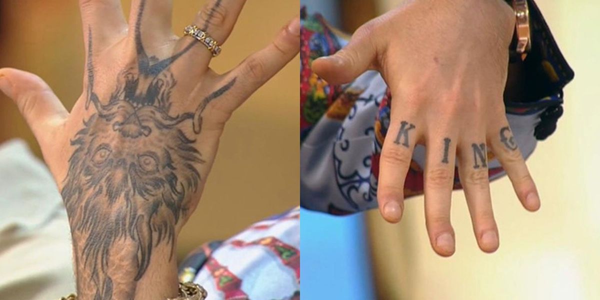 На левой руке он продемонстрировал тату в виде слова KING («король») – по одной букве на каждом пальце. Правда, из-за обилия колец эти литеры трудно заметить.