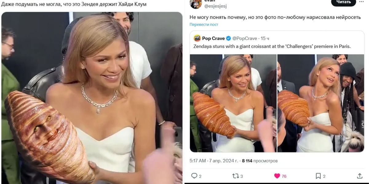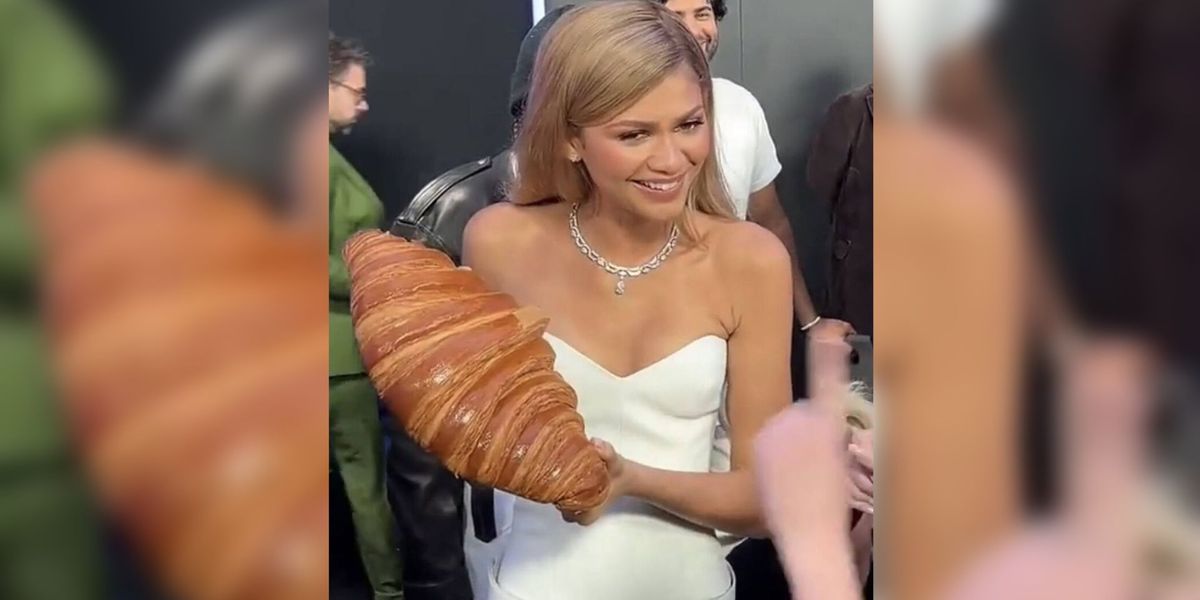 Зендая, удивленная, но очарованная подарком, с радостью поблагодарила фанатов. Она позировала с гигантской выпечкой, шутила, что хочет «положить» ее в платье, и даже предложила разделить круассан с коллегами.