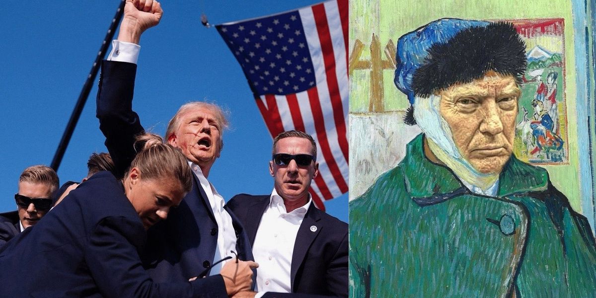 Под прицелом мемологов оказался и победитель президентской гонки США Дональд Трамп.После инцидента с покушением, где политик получил легкое ранение уха, социальные сети наполнились смешными картинками, обыгрывающими этот инцидент. Особую популярность приобрела пародия, где экс-президента сравнили с автопортретом Ван Гога.