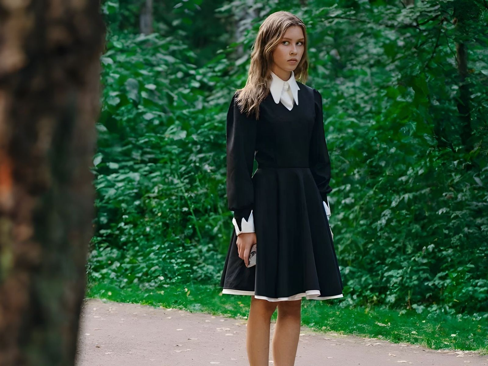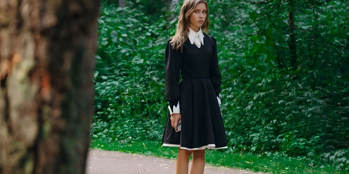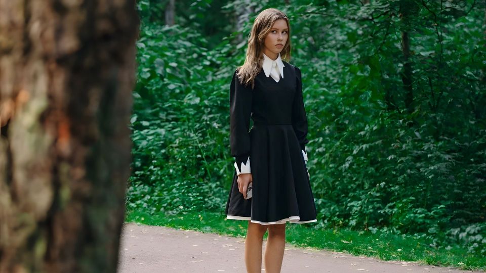 Пользователь ТикТока cracker126 опубликовал видео с доказательством: постер фильма с главной героиней, следом – скриншот из онлайн-магазина. Платье доступно в тех же цветах, розовом и чёрном, фасон идентичен.