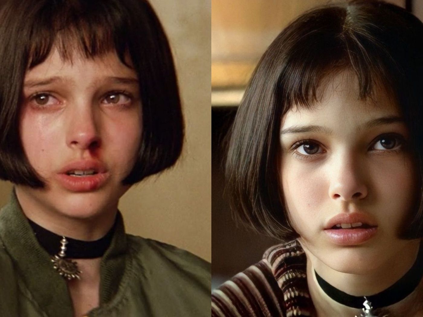 Она полностью повторяет образ Натали Портман из фильма "Леон": короткое каре, чокер, бомбер.