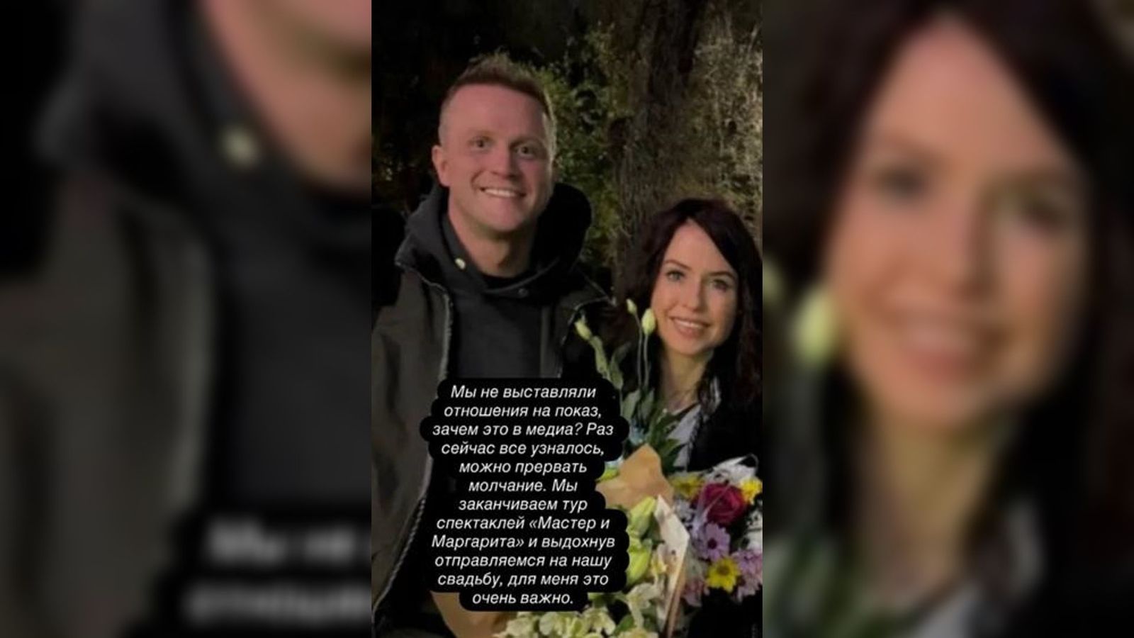 "Мы не выставляли отношения напоказ, зачем это в медиа? Раз сейчас все узналось, можно прервать молчание. Мы заканчиваем тур спектаклей "Мастер и Маргарита" и, выдохнув, отправляемся на нашу свадьбу, для меня это очень важно".